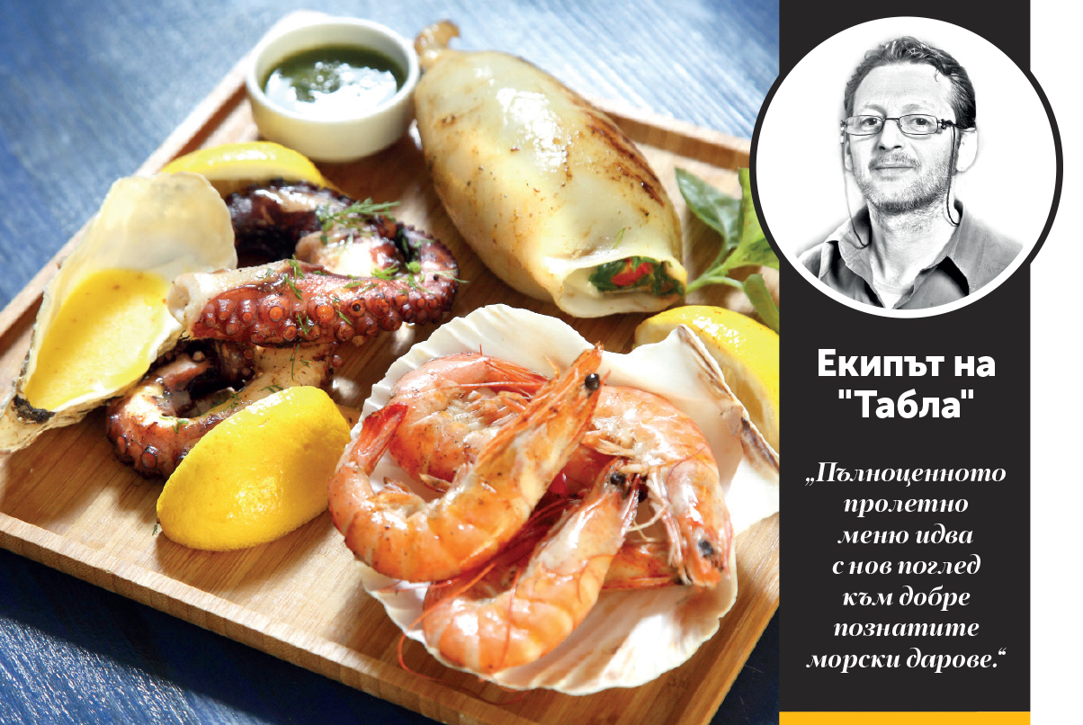 Когато през май не можеш да отидеш до морето, морето идва при теб с новото пролетно меню в „Табла“. Майсторите в кухнята буквално яхват вълната с авторската рецепта за средиземноморско плато с пълнен калмар, октопод на грил и тигрови скариди, които могат да бъдат поръчани и поотделно. Нищо не отброява по-добре оставащите дни до лятото, както чисто новите рибни предложения в менюто тук.