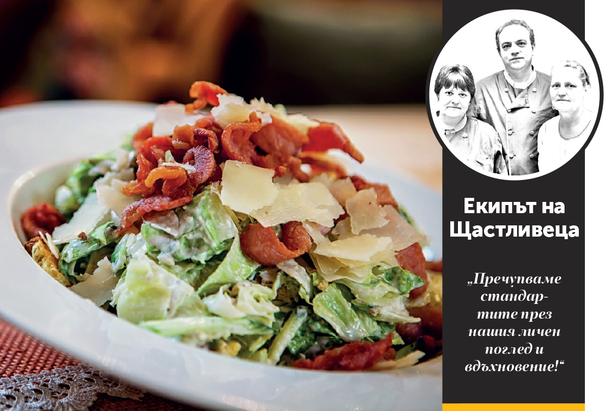 Цветовете около нас са пъстри, вкусовете свежи, а ароматите са спомени. Сезонното меню на „Щастливеца“ предлага богат и избор от ястия, приготвени в интересен „кулинарен аранжимент”, а ето и най-любимия ни фрагмент от него. Вариация на „Цезар“ със зелена салата, айсберг, краставици, пържен натурален английски бекон, аншоа, натрошен домашен царевичен хляб, сирене „Пармезан“ и домашен „Цезар“ сос с хрян.