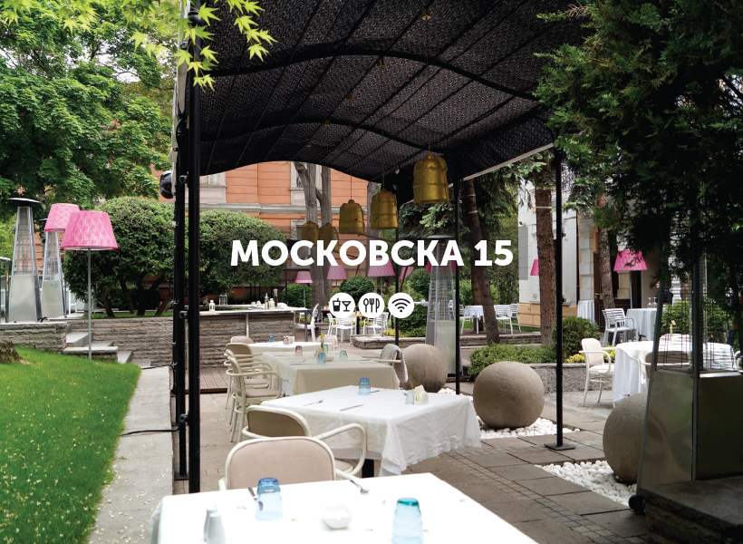 Атмосферата в градината на „Московска 15“ е силно повлияна от романтиката на стария дворец, срещу който се  намира. Обграден от сенчести дървета, пролетни ухания и пеещи птичета, за миг би могъл да си помислиш, че си се върнал назад във времето, когато в парка са се разхождали кралски особи. Според легендите заведението  дори се помещава в къща, която била подарък от княз Фердинанд за една от любимите му. Тук ще попаднеш на  изчистена визия, минималистичен интериор, музика на живо и смел готвач. Познати на вкус продукти, ще ти бъдат поднесени по възможно най-неочаквания начин. Така например можеш да си хапнеш пролетен десерт с краставица, зелена ябълка, сладолед йогурт, мента и ягоди, който всъщност е вдъхновен от таратора. Ул. "Московска" 15