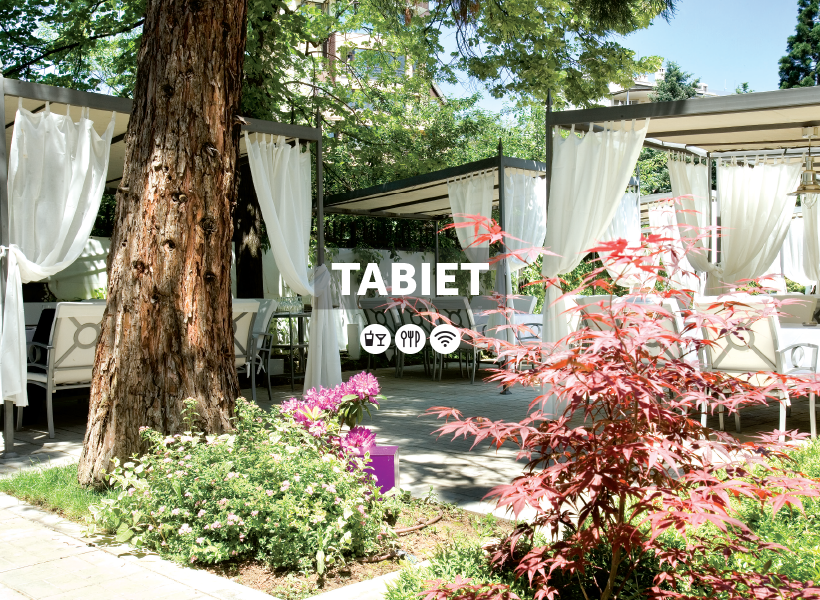 Градината на шикозния ресторант „Табиет“ в Лозенец е като романтична картичка, изписана с големи шатри от ковано желязо, бели полюшващи се завеси и всичко това насред зеленина и цветни храсти. Шумът и градската лудница остават зад стените на ресторанта и още щом седнеш на меките възглавнички, те обзема нежно спокойствие и сетивата ти са готови да поемат доза от страхотните кулинарни аромати, идващи от пресни миди,  калмари, риба от охладената им витрина. Разнообразното средиземноморско меню ще захранва нашите морски  мечти през целия летен сезон. За истинските табиетлии всяка седмица ресторантът представя избрано вино на  специална цена. През юни винената листа включва бели вина и розета от Стария и Новия свят. Бул. "Джеймс Баучър" 76