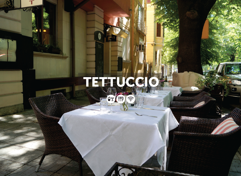 Tettuccio ще те спечели с кокетна градина и тихо разположение на артистичната „Оборище“. Градината на  италианския ресторант се открива пред теб, след като минеш под красивата арка от ковано желязо и стотиците  малки лампички, блещукащи като скъпоценни камъни. Тук, сред зелени дръвчета и романтична атмосфера,  можеш да се насладиш на истински италиански специалитети, от които силно ти препоръчваме парче торта, приготвена по домашна рецепта. Ул. "Оборище" 63