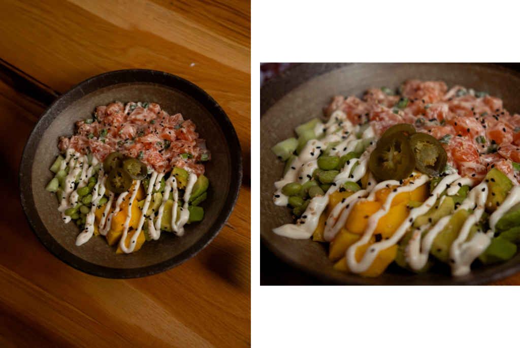 леко, свежо и цветно ястие, в което всяка съставка играеше своята роля. Сьомгата се маринова с понзо – цитрусово-соев сос, който ѝ придава изискан баланс между солено и кисело. Оризът е овкусен по всички правила на суши изкуството, а върху него нежно лежат едамаме, краставица, авокадо и парченца манго. Завършекът е пикантна майонеза със срирача и понзо – фин щрих, който обединява всичко в едно цяло.