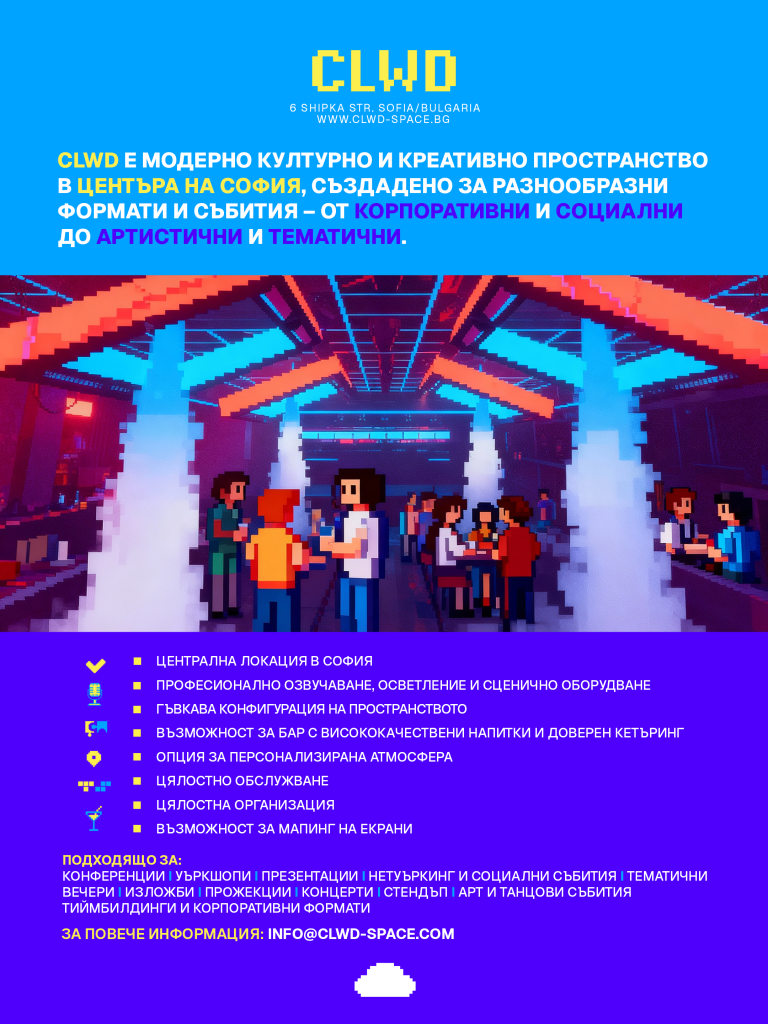 За повече информация или за да запазиш CLWD Space за твоето събитие, пиши на: info@clwd-space.com