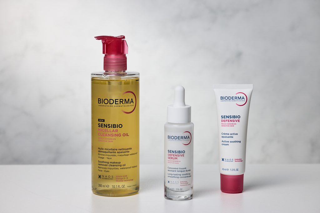 На снимката: Sensibio Micellar cleansing oil – Мицеларно почистващо олио за чувствителна кожа; Sensibio Defensive – Успокояваща грижа за чувствителна кожа, подсилва кожата срещу агресори; Sensibio Defensive serum – Успокояващ серум за чувствителна кожа