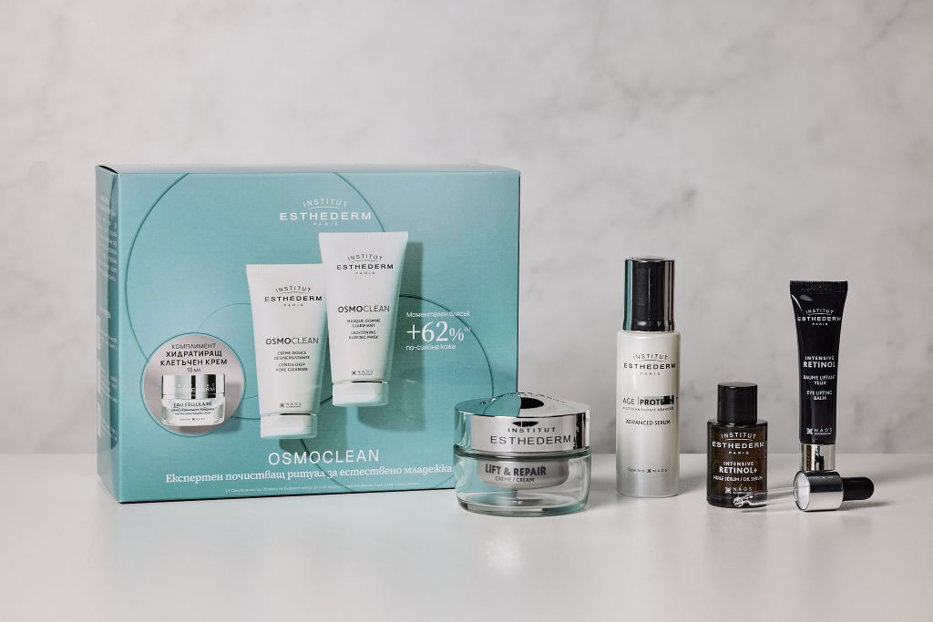 Промо кутията Osmoclean поставя началото на всяка ефективна рутина – експертен почистващ ритуал за сияен тен и оптимална подготовка на кожата за следващите нива на грижа. След перфектно подготвената кожа идва моментът за целенасочена грижа. Сред акцентите е „Дуо за дълголетие на кожата“ – съвършена ежедневна комбинация. Серумът AGE PROTEOM™ Advanced Serum е любов от първото нанасяне. Той защитава ключовите протеини в кожата и спомага за запазване на нейната младост. След това идва ред над Lift & Repair – изглаждащ крем за бръчки с високоефективна лифтинг грижа, която възвръща плътността и стегнатостта на кожата, като видимо изглажда бръчките. За кожа, която има нужда от интензивно обновяване, изравняване на тена и корекция на бръчките, Esthederm предлага алтернативна рутина с ретинол – комбинация от два продукта с висока ефективност и отлична толерантност. „Нежната ретинолова двойка“ е създадена за онези, които търсят по-активна коригираща грижа, и включва Intensive околоочен балсам с ретинол, който изглажда и освежава деликатната околоочна зона, както и Intensive серум-олио с ретинол с 0,3% чист ретинол и подсилващ комплекс за оптимална поносимост.