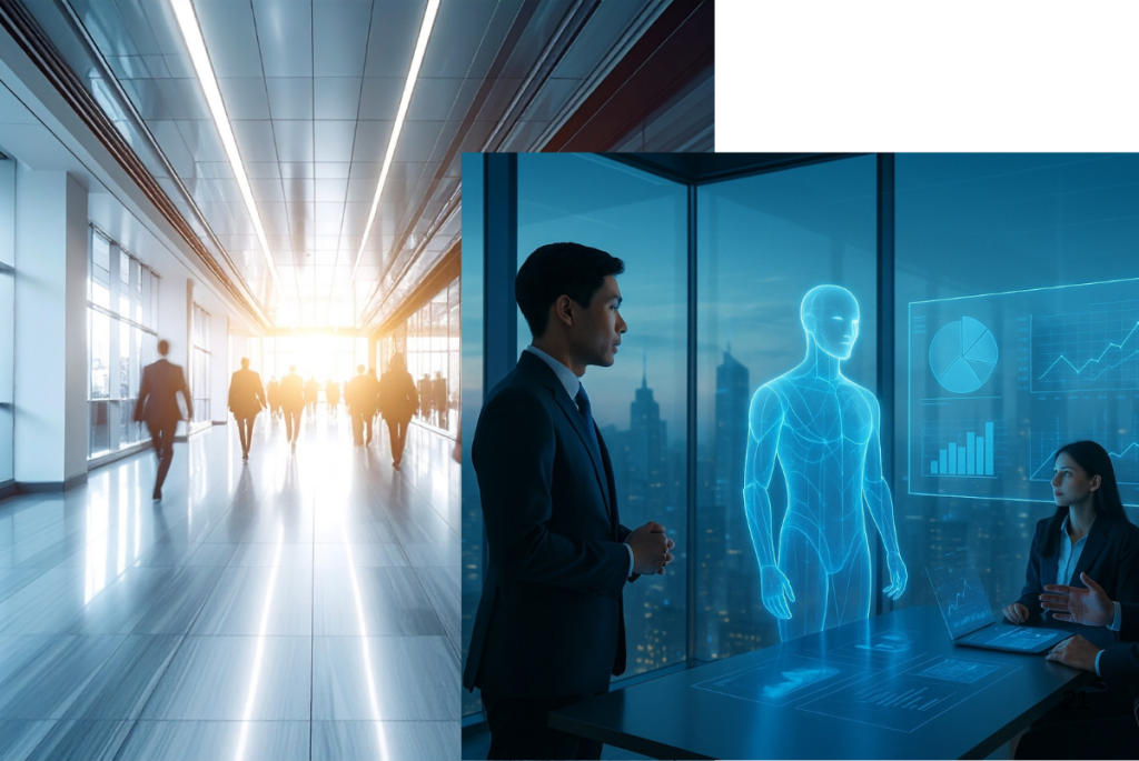 Офисът вече не е място, а състояние. Няма бюра. Има зони за фокус, които те пускат вътре само ако си достатъчно концентриран. Дейли срещите вече се случват с холограмни аватари, така че не е нужно да си с чиста коса в понеделник.