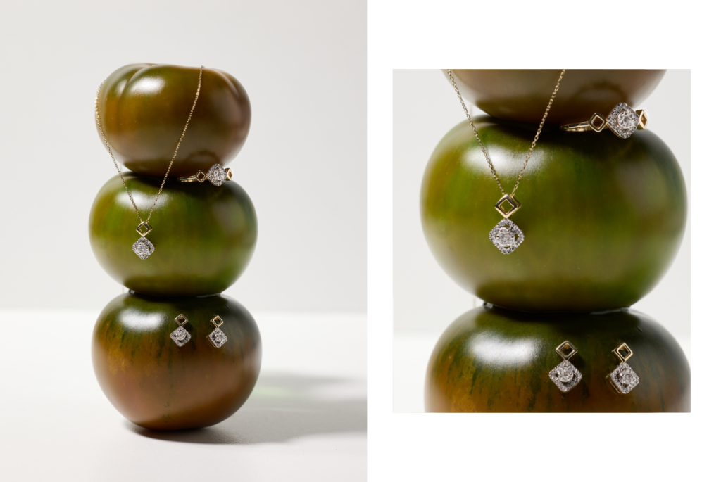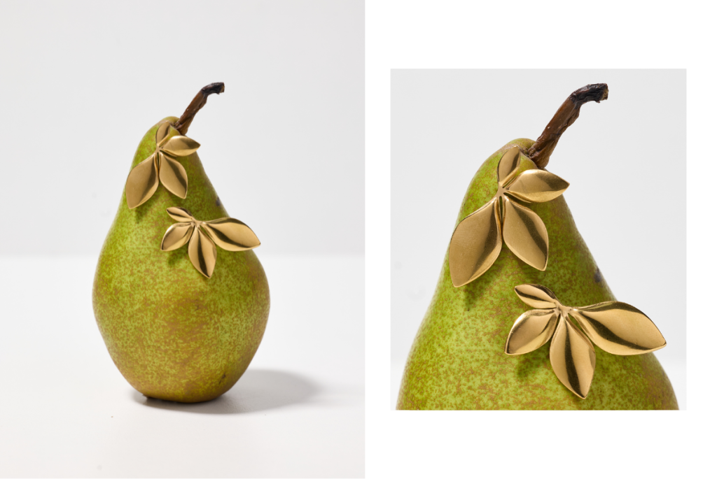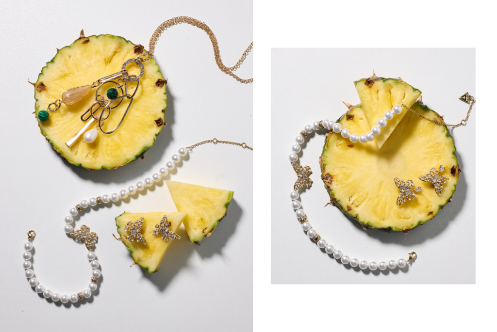 В кадрите деликатността на крушата среща фини златни акценти, а сочният ананас се превръща в сцена за по-смели, но все така елегантни бижута.