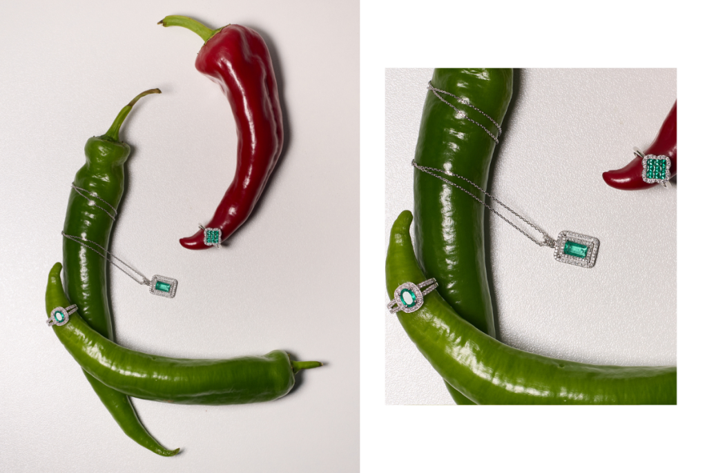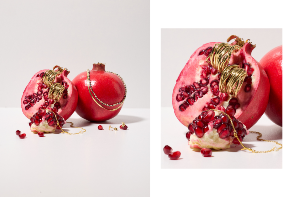 затова събират артисти, вложили сърце и душа в работата си. За тях бижуто е много повече от аксесоар, то е преживяване, спомен и жива емоция, която носи енергия и напомня за места и хора, оставили траен отпечатък в сърцето ни. В този кадър сочният нар се превръща в символ на красота и изобилие, а изящните бижута – негово естествено продължение, деликатно подчертаващо текстурата и цвета.