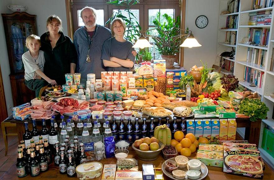 Особено интересен проект, който слага на масата проблема “с какво се храним”. Докато в някои точки на света хората отглеждат храната си, в други я купуват в примамливи опаковки. Peter Menzel и Faith D’Aluision снимат семействата с храната им, предвидена за една седмица. Съвсем бегъл поглед може да ти даде информация, както за хранителните навици по дадени ширини, така и за стандарта на живот, който поддържа семейството и отношението му към здравословното хранене. Балансът между свежата храна и пакетираните продукти е един от най-интересните ъгли, от които може да погледнем седмичното меню. Седмичният бюджет за храна на заснетите семейства варира от 30 долара в Мали до 568 в Германия (снимката по-долу).