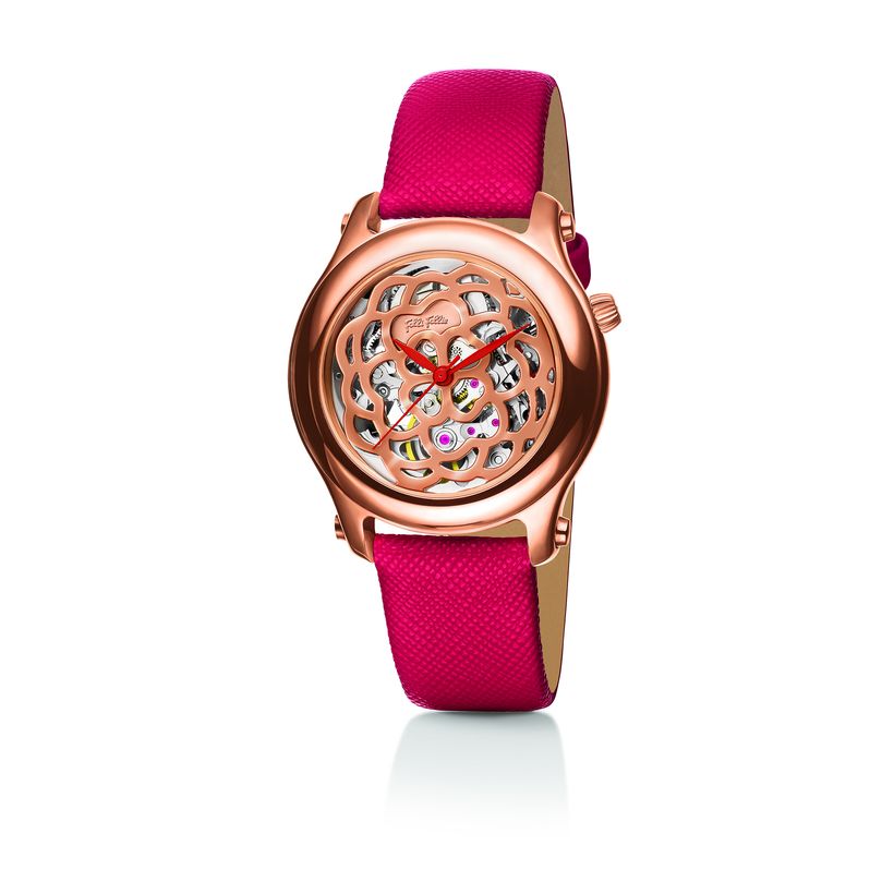 Изключително динамична, но и много женствена, колекцията Santorini Flower Diaphanousе съчетание от ръчна изработка с бляскава функционалност. Ще ги познаеш по отличителния корпус от стомана или с розово златно покритие, с емблематичния мотив Santorini Flower на циферблата. Семпли или украсени с винтидж розови циркони, цветето на Санторини върху циферблата деликатно разкрива автоматичния механизъм на часовника.
