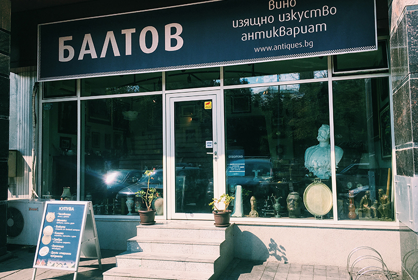 „Антиквариат Балтов“ е точно до „Дом на киното“ на ул. „Екзарх Йосиф“ 37 и след като видиш синята му табела и изкачиш две-три стъпалца, се озоваваш някъде много назад. Тук можеш да намериш неща, като сребърни лъжички от 1891 г., униформа на капитан от артилерията от преди 1945 г., красиви медни гюмове и още бижута, монети, ордени и медали, картини, та дори и български вина.
