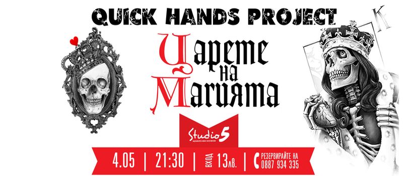 Quick Hands Project са група момчета, които, накратко казано, създават магия. Или поне са достатъчно добри, за да те накарат да повярваш в това. Всъщност те са и единствената магична организация в страната, член на International Brotherhood of Magicians. Така че, ако искаш лично да провериш колко бързи са наистина ръцете им, ще трябва да се отбиеш до Studio 5 този четвъртък. Предупреждаваме, че има голям шанс да видиш гаджето, разрязано на две, но пък по-оригинална идея за среща – здраве му кажи!