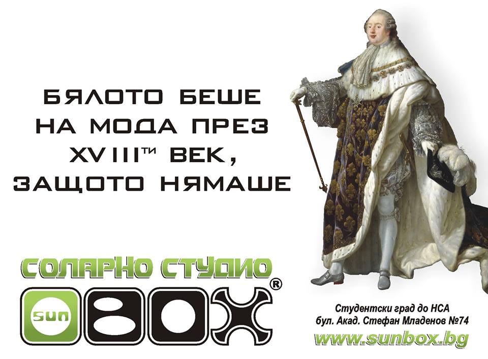 Столично соларно студио решава да привлече клиенти, поставяйки провокативен билборд и реакциите не закъсняват. Френският крал Луи XVI (1754-1793) очевидно не е имал възможността да получи шоколадов тен, поради липсата на съвременните технологии и със съжаление констатира, че е робувал на някакви си модни тенденции. Реклама на соларно студио се асоциира с красива дама с нежна кожа и бронзов тен. Да, ама не.