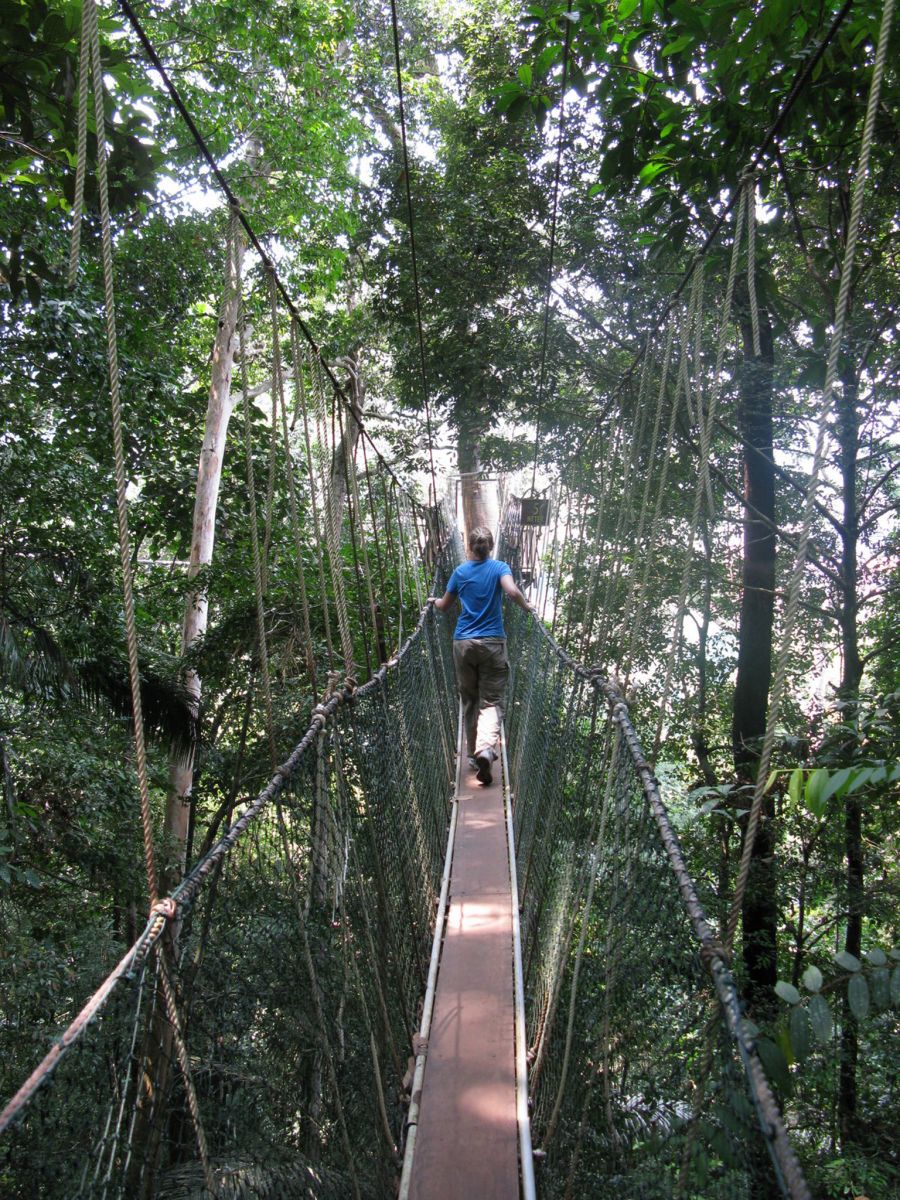 От плаващия ресторант веднага се качихме на перахуто, завързано на док от другата му страна, и с още няколко души от нашата компания, допълнена от група германци, американци и холандци, поехме към балдахиновата пътека. Витата стълба, закрепена за ствола на едно особено дебело дърво, измори всички освен водача ни Меор. Стъпалата сякаш нямаха край, зави ми се свят от постоянното въртене около ствола на колоса, но накрая стигнах площадката, от която сякаш в небитието изчезваше въжен мост, широк едва метър и половина, много подобен на онзи, по който вървеше Индиана Джоунс в края на втория филм. След няколко дена ще си в по-добра форма, ухили се окуражително Меор, докато ме гледаше как бърша потта от челото си. Шокът от изкачването до пътеката обаче продължи, тъй като едва стъпил върху нея, тя така се залюля, че сграбчих въжетата отстрани и разбрах защо е сложена предпазната мрежа, стигаща до кръста, а на определени места – и до раменете. Изглежда всеки път, когато погледнех надолу, височината се увеличаваше, но истината е, че пътеката се спуска и изкачва, и всъщност височината й варира от 50 до 25 м. И докато следвах холандката пред мен, която безстрашно напредваше, изведнъж люлеенето на въжените мостове започна да ми харесва, по-малко стоях на дървените платформи, сковани около стволовете на дърветата, за които бяха закачени отделните отсеци на пътеката, особено когато осъзнах, че се намирам в един съвършено нов свят, който малко хора могат да видят – движех се по върховете на джунглата, в короните на някои от най-високите дървета, обитавани от животни и насекоми, които никога не слизат на земята и няма как да бъдат видени, цветя които се нуждаят от слънце и цъфтят само на определена височина и др. Туалангата например подобно на някои видове борове започва да се разклонява едва от 25 м нагоре. Множество палми също протягаха врат към пътеката, а тялото на една от тях бе покрито с огромни шипове, които издават звук като от музикален инструмент, когато се отчупят; предвидливо тук системата от мостове беше издигната нависоко и само на едно място минаваше покрай няколко от нейните представители, където Меор ни събра на платформата, и когато се увери, че сме всички, откърши един шип, дълъг поне 4-5 см. Чу се звук като от камертон, само един тон, но Меор каза, че всеки бодил си има собствена мелодия. Но най-впечатляващи бяха птиците, които кацаха и отлитаха от клоните – зелени гълъби, многоцветни папагали, кресливи тукани.