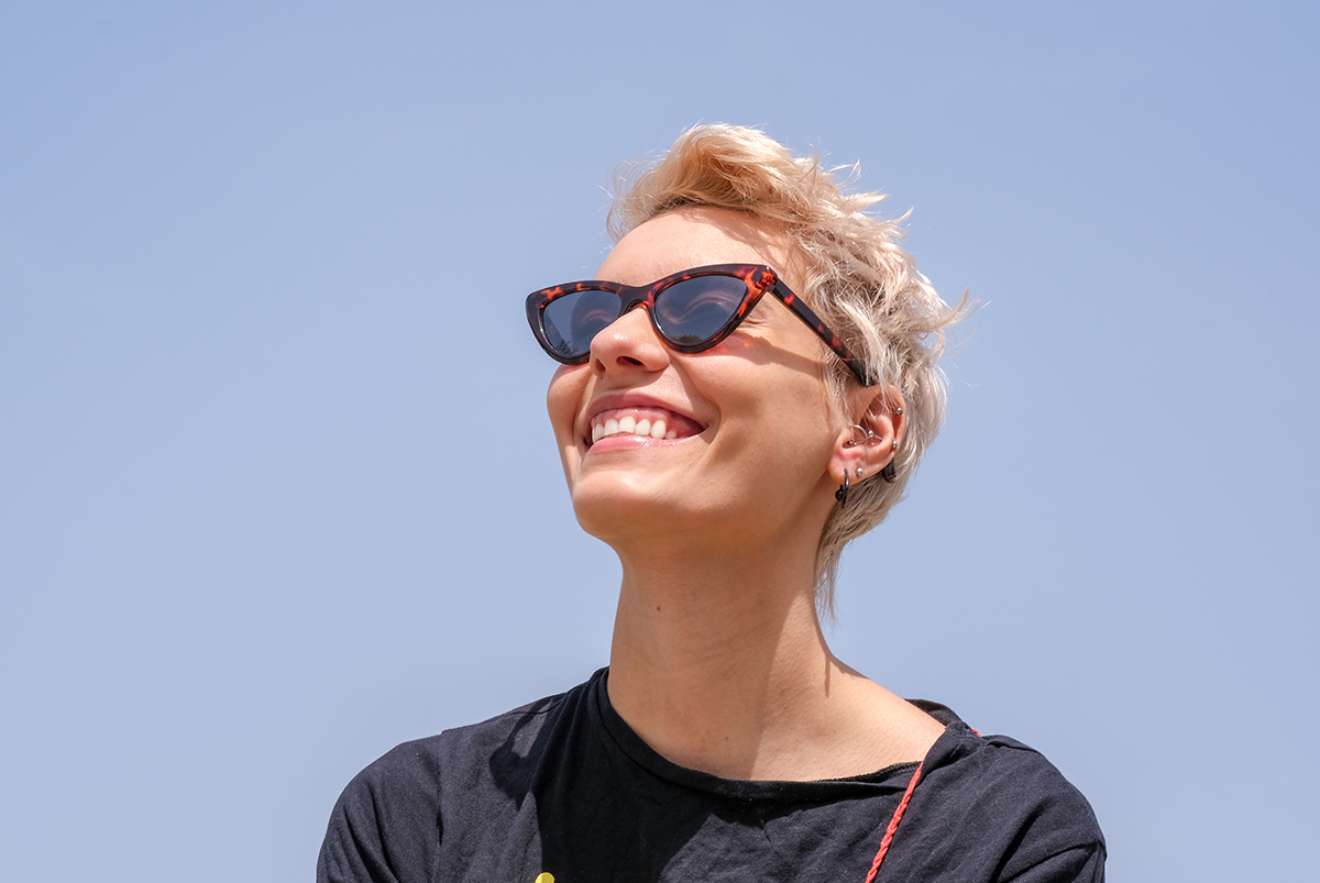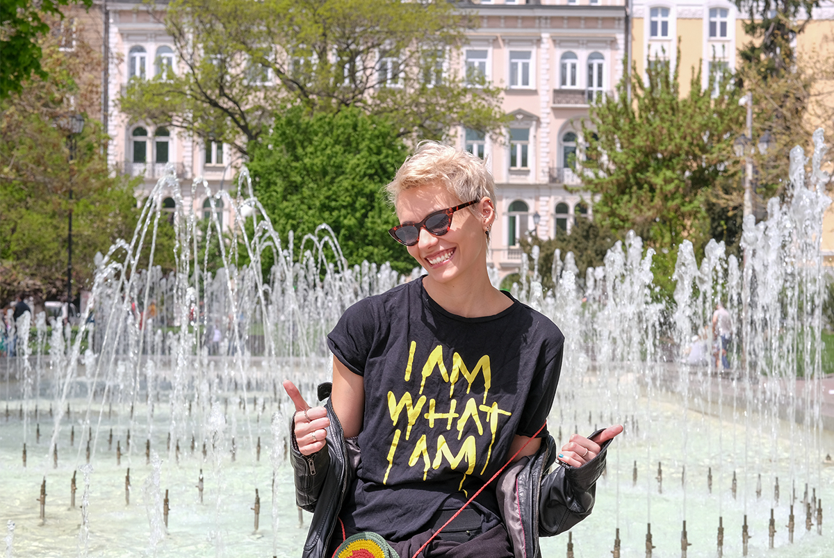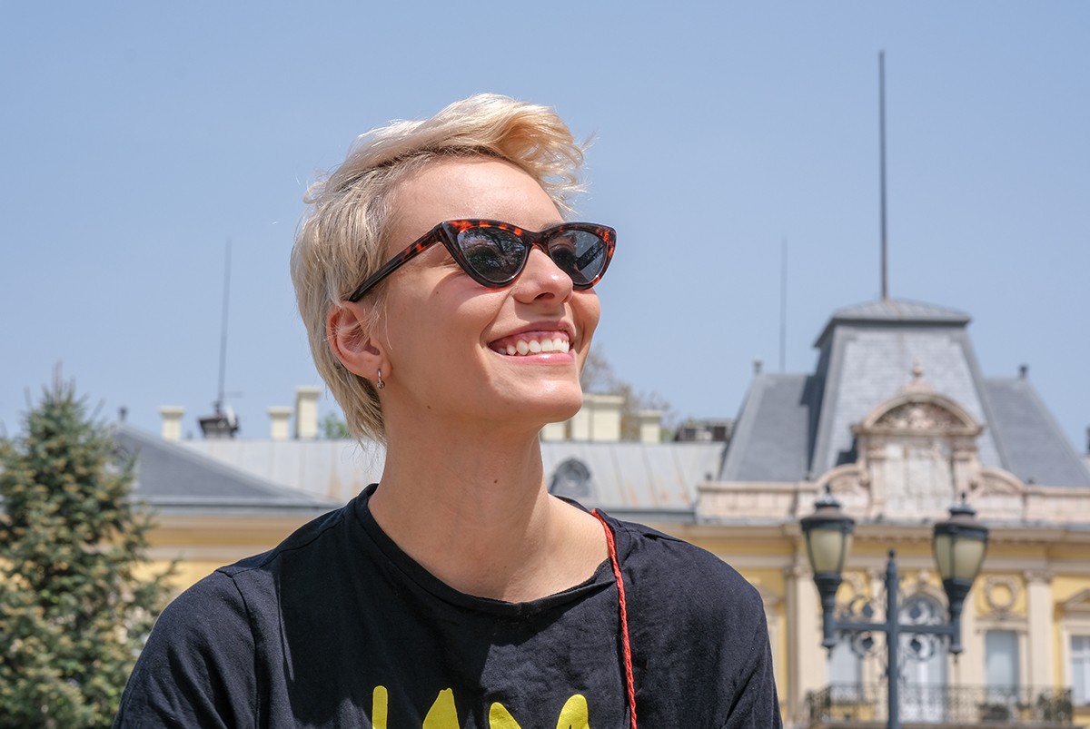 Първият ни усмихнат герой е Александрина Александрова. Най-вероятно я познаваш като Александрина от група „Парапланер“, Александрина с дългите крака, Александрина от страниците на модните списания, Александрина с баса на гърба крачи по „Раковска“ или Александрина, която е това, което е. Ако искаш да се заредиш, пусни си някое от парчетата на бандата, в което първо ще ти се усмихне гласът ѝ. Едно е сигурно, ще искаш да слушаш още дълго, защото освен да зарежда, гласът на Александрина умее и да разказва истории. Послушахме го, докато отговаряше и на въпросите ни. За усмивките. От цветната градинка пред Народния, по обяд, когато и слънцето усмихнато на небето грееше.