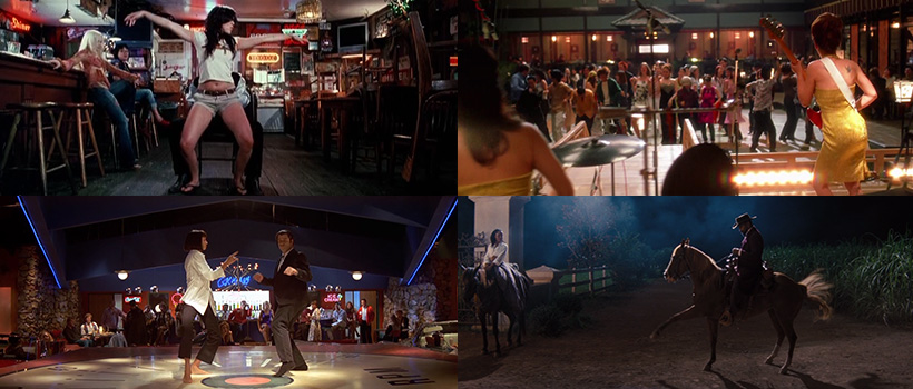 Освен че се любуваме на прекрасна музика, във филмите на Тарантино нерядко се любуваме и на танцови сцени. От забавния танц на психотичния г-н Рус на фона на "Stuck in The Middle With You" точно преди да отреже ухото на ченгето Марвин Наш, през епохалната сцена от конкурса по туист в Джакрабит Слимс между Винсънт Вега и Миа Уолъс, чак до танцуващия кон в края на "Джанго без окови".