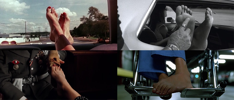 Фетишът по ходилата със сигурност е най-разпознаваемата запазена марка на Куентин и сам по себе си може да бъде цяла отделна тема, но ние искаме да включим колкото може повече и затова започваме с него. В киното на Тарантино се наблюдава градация спрямо излагането на този фетиш, като в по-ранните му филми, ходилата приемат по-скоро естетическа форма и влизат в диалога ("Криминале", "Джаки Браун"). В по-късните ленти ("Убий Бил", "Разходка смърт", "Гадни копилета"), ходилата заемат все по-важна драматургическа стойност. Ако залагаме на количеството – "Разходка смърт" безспорно е върхът в излагането на тази тарантиновска мания. Освен че започва с два последователни кадъра с ходила, в лентата можем да видим как един от главните герои, Каскадьорът Майк (Кърт Ръсел) буквално облизва пръстите на краката на Абърнати (Розарио Доусън). Но ако трябва да отсъдим най-маниашката сцена с ходила в творчеството на Тарантино, приза определено печели лентата от 1996 – "От здрач до зори", режисиран по негов сценарий от приятеля му, Робърт Родригес. В конкретния момент самият Куентин (в ролята на Ричи Геко) пие текила от пръстите на Сантанико Пандемониум (Салма Хайек).