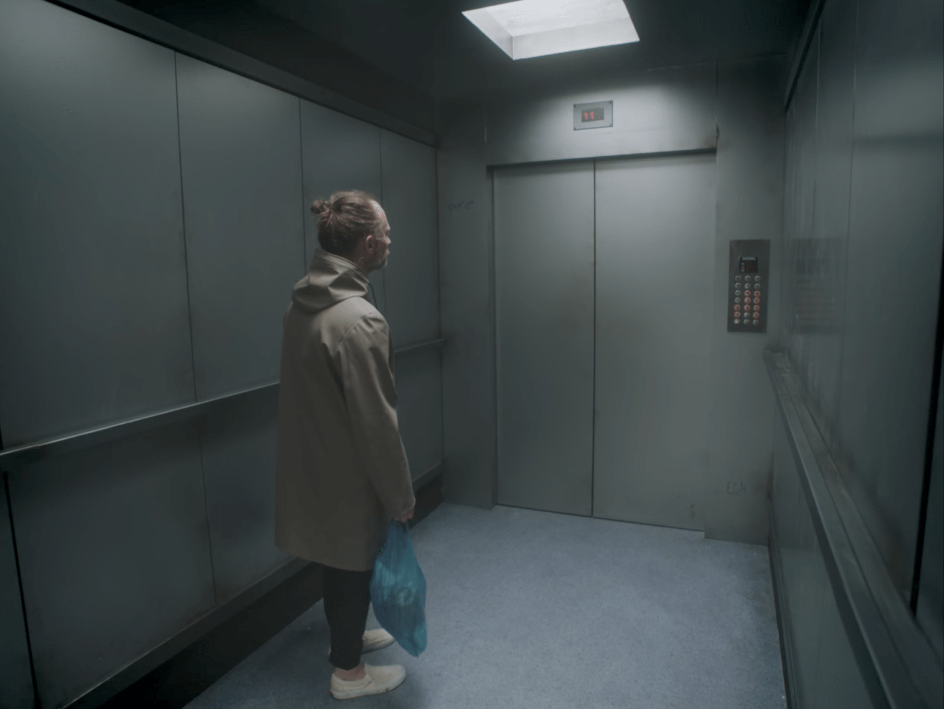4-минутното видео ни показва как Том се вози сам нагоре-надолу в тясната сива кабинка, стискайки две торби с покупки в ръцете си. Хората влизат и излизат от асансьора и от живота му, а той просто ги наблюдава отстрани, без дори да помръдне.