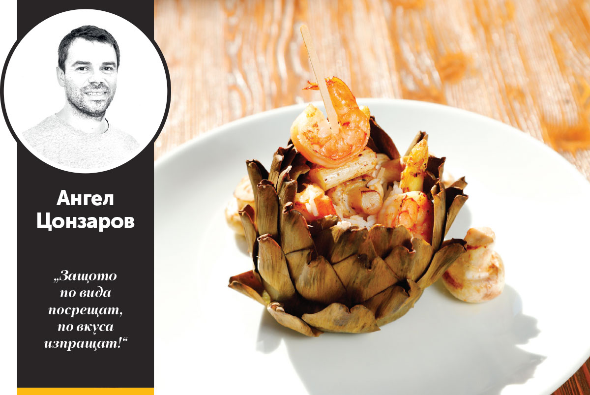 На първо виждане няма да искаш да развалиш тази красива чиния, но на второ ще бъдеш подмамен от ризотото със скариди, аспержи и гъби, които ти намигат от средата на този артишок, приканвайки те да ги вкусиш. Ние лично бяхме много бързи в тази среща и само за минути не оставихме и спомен от тази вкусотия. Хубавото е, че когато не си си у вас, винаги можеш да си поискаш и още, и още, и още.