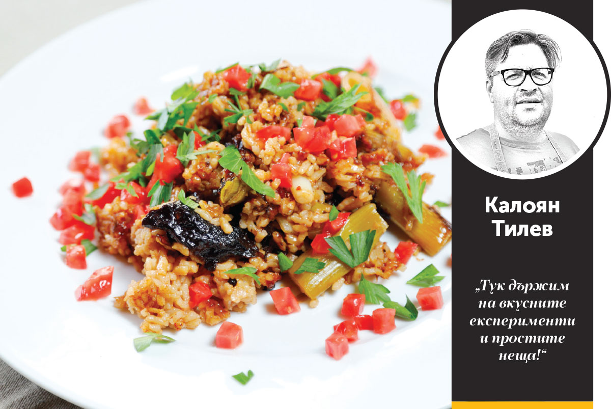 Приятели с над 30 години практически стаж, които обичат да готвят неща, които харесват, и да се радват на колорита. Така можем да определим екипа тук, а това, което ни поднесоха, е като еквивалент на постулата, че съвършенството се крие в простотата. Праз със сини сливи и ориз, без излишни подробности, без претенции, напълно в сезона и с вълнуващ вкус, който ще запомниш.